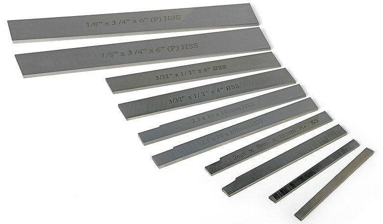 HSS 1,5 × 4,5x63 mm, HSS 1,5 × 5,5x63 mm, HSS 1,5 × 5,5x80 mm, HSS 1,5 × 8,25x73 mm, HSS 2x8x75mm, HSS 2.5x10x100 mm, HSS 3/32 ″ x1/2 ″, x4 ″, 3,5x12x125 mm, HSS 1/8 ″ x3/4 ″ x6 ″